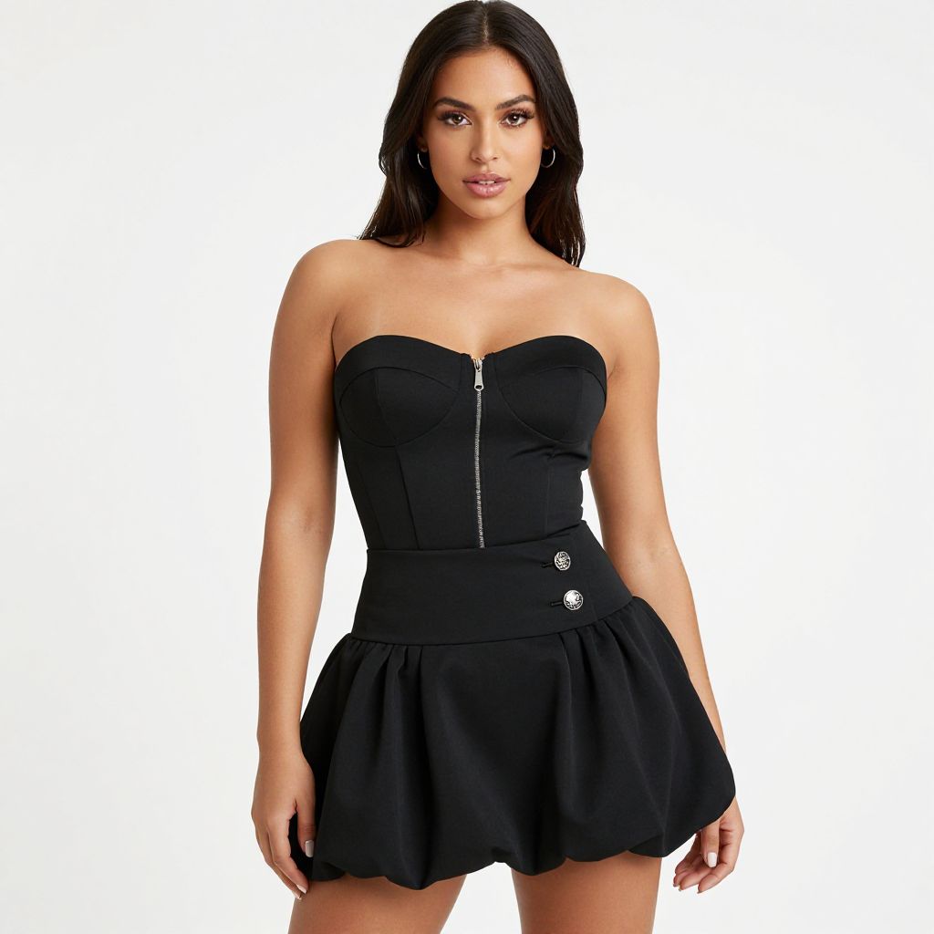 "Woman, modern chic, black strapless mini dress with a silver zipper detail down the front, sweetheart neckline, high-waist cut, complemented by two decorative silver buttons, a form-fitting top that transitions into a slightly flared skirt, plain white background.. Sexy. Pretty face and beаutiful eyes. Big breasts."