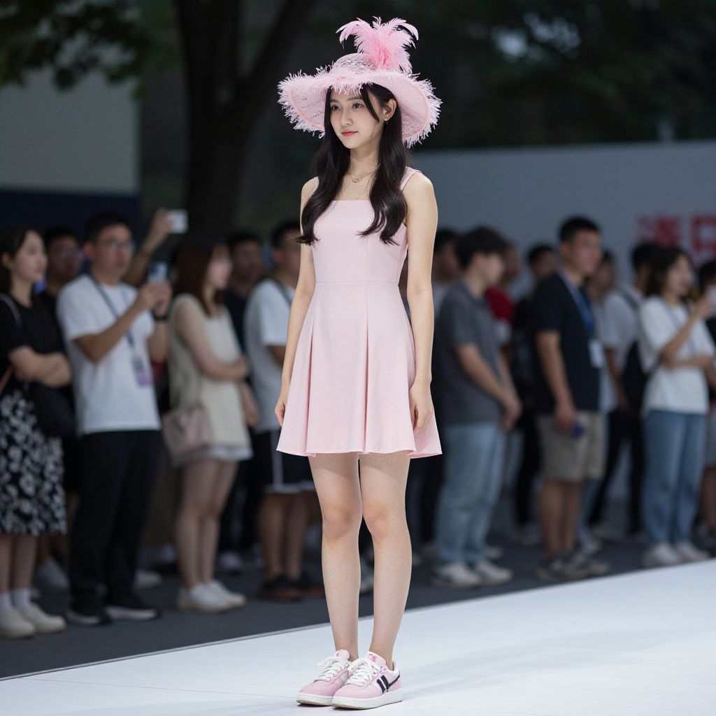 Female model wearing a pink dress with a pink feather hat on her head. The model is wearing a pair of pink sneakers and has long dark hair. The background is blurred, but we can see a group of people in the background.