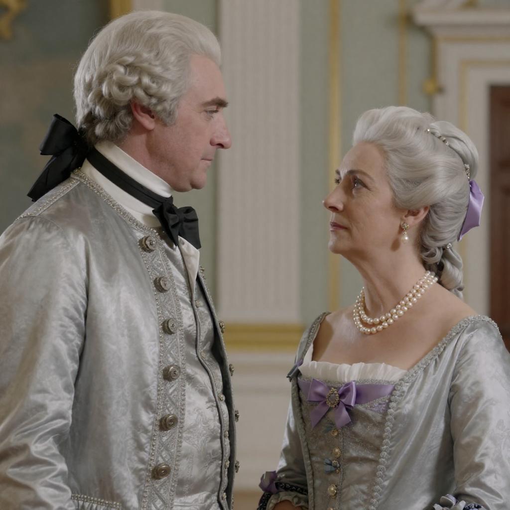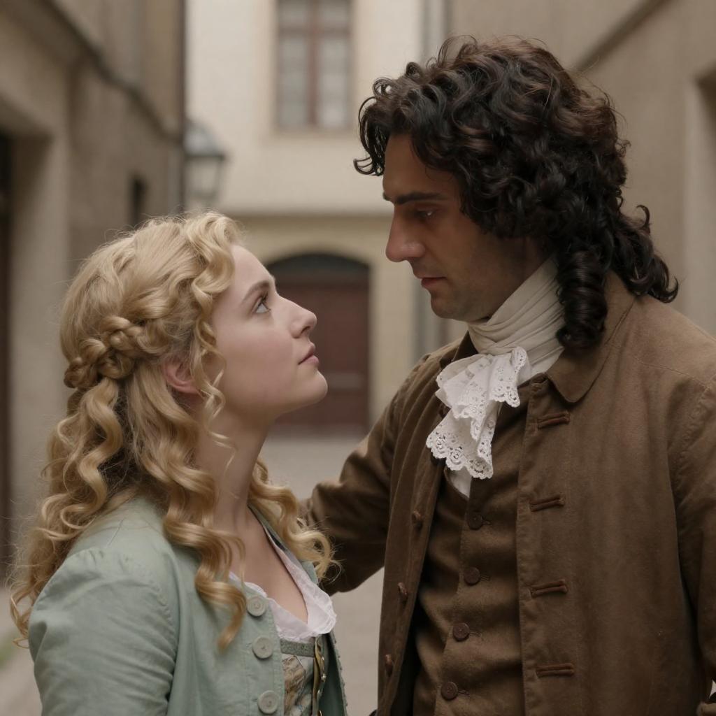 Photograph of two aristocratic people in period attire. Man with white hair, black bow, ornate silver jacket, facing woman. Woman with white hair, purple ribbon, off-shoulder dress, pearl necklace, earrings. Intense gaze, elegant setting. Background with classical architecture.