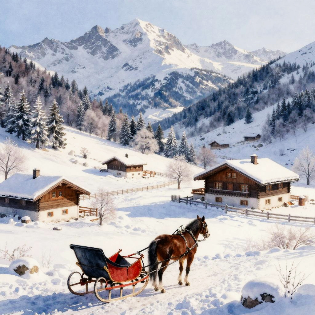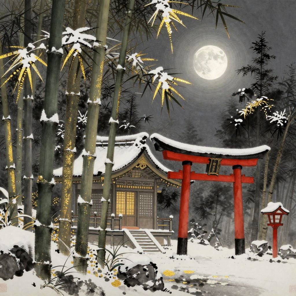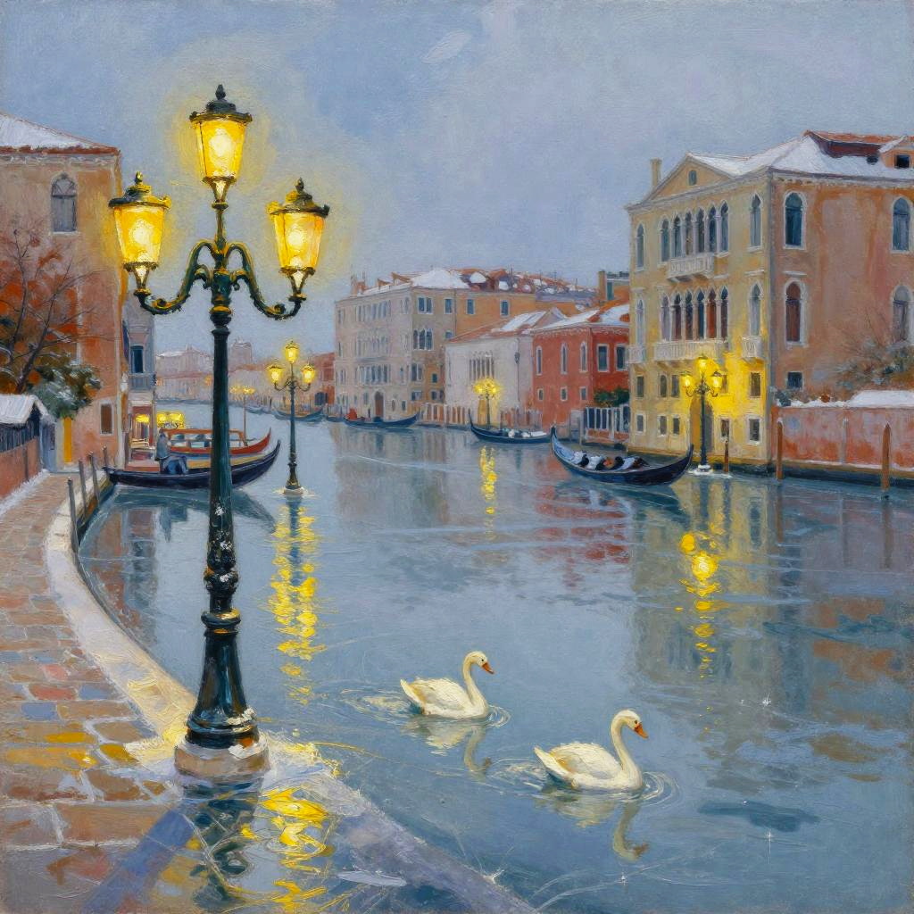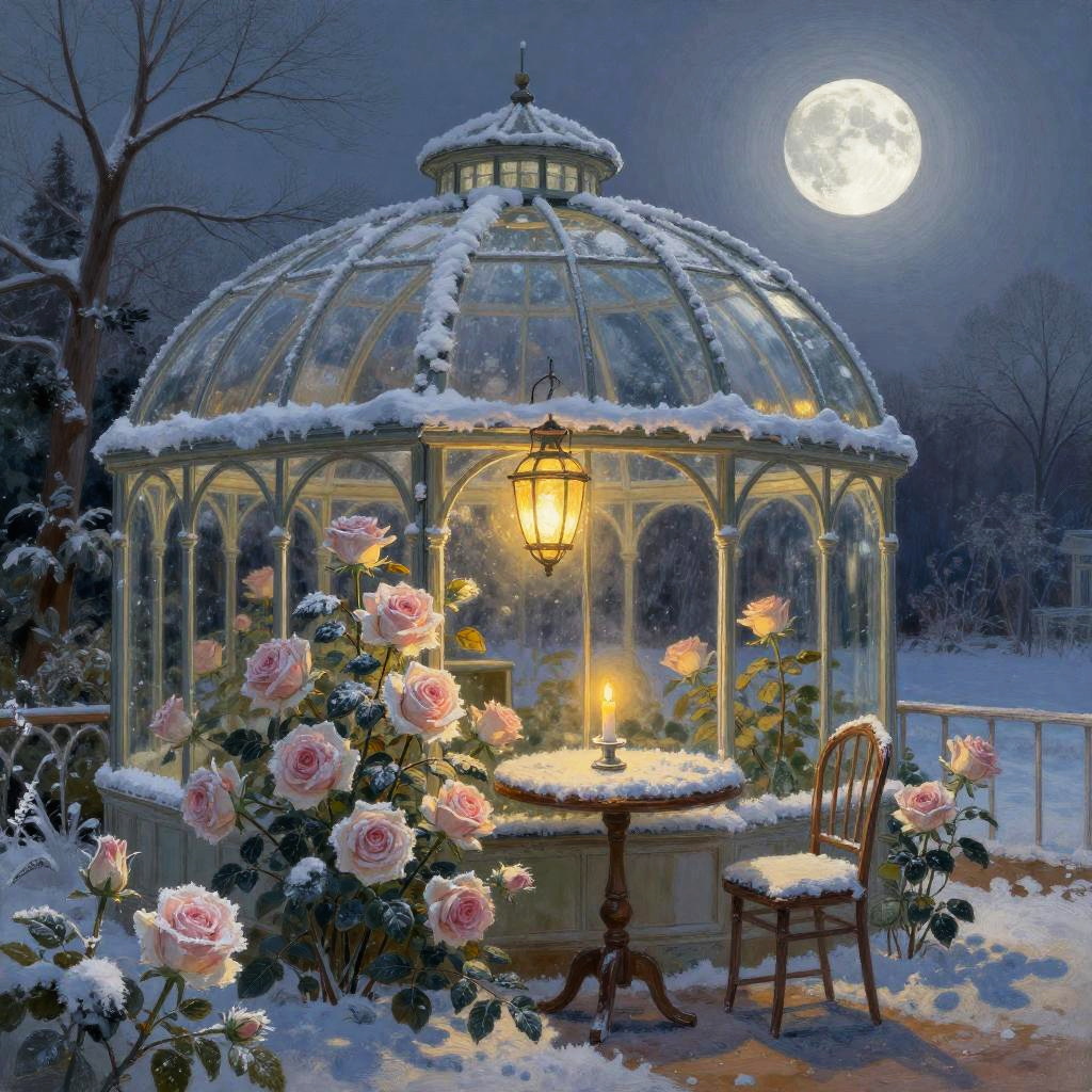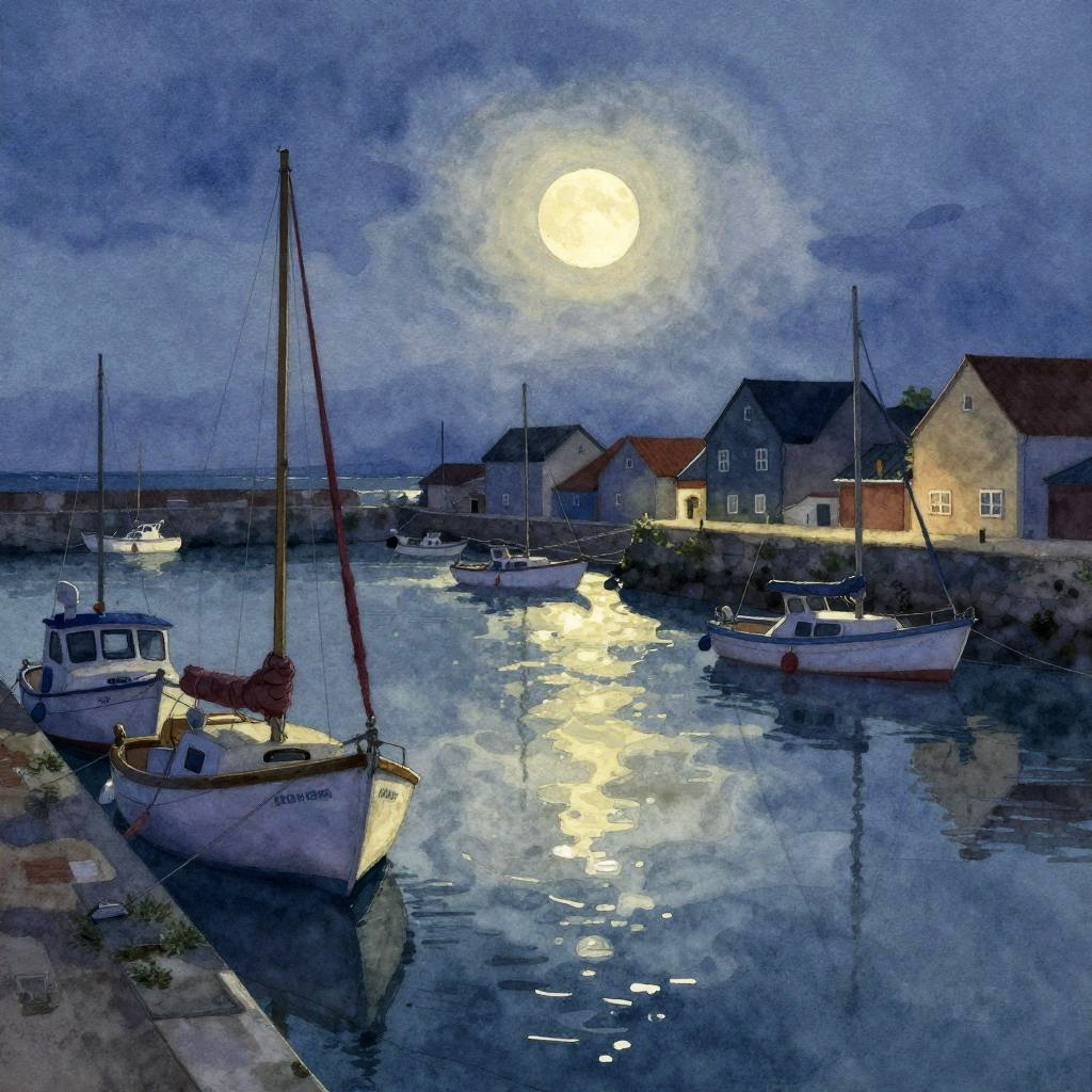 A neo-romantic gouache painting of a frozen harbor with bobbing wooden fishing boats, frost-laced ropes, and a snow-dusted quay, bathed in cold silvery twilight with pearlescent moonlight glinting on ice, evoking tranquil winter romance.