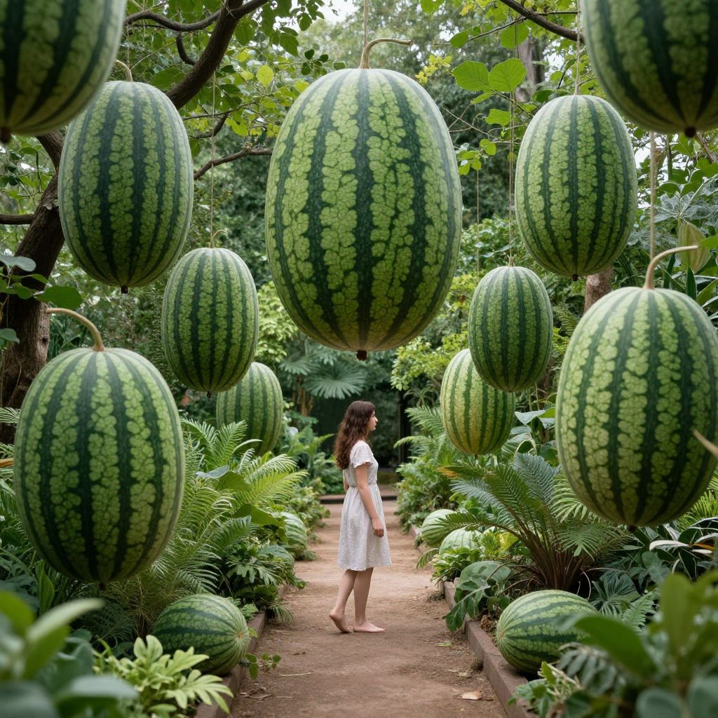 A surreal garden where watermelons defy gravity, floating effortlessly amidst lush foliage as a woman walks barefoot along a path, seemingly untouched by the whimsical, weightless world around her.