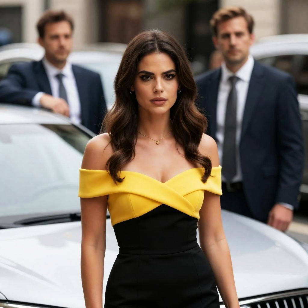 Woman with wavy brown hair, black and yellow off-shoulder dress, and necklace stands in front of a silver car. Two men in suits lean on nearby cars. Urban street background. Intense facial expression. Three people. Daylight.