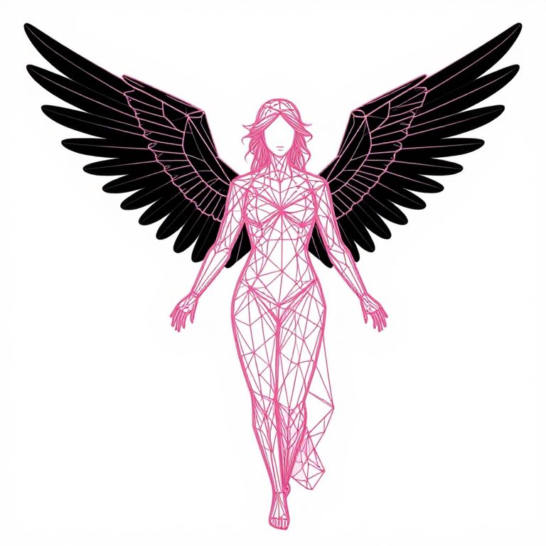 The image presents a striking geometric minimal design featuring a female angel figure. The angel is composed of sharp, clear lines in a pink and black color scheme against a white background, creating a striking contrast. The figure's body is intricately detailed with a network of lines that form a complex, almost skeletal structure, emphasizing the angel's form and contours. The wings, depicted in black, are large and outstretched, adding a sense of motion and dynamism to the composition. The overall arrangement of the lines and shapes creates a sense of depth and dimension, with the angel appearing to be in the foreground, while the wings extend outward, almost as if they are about to take flight. The image is 8K, indicating a high resolution that captures the fine details of the geometric design.