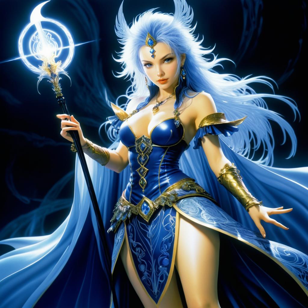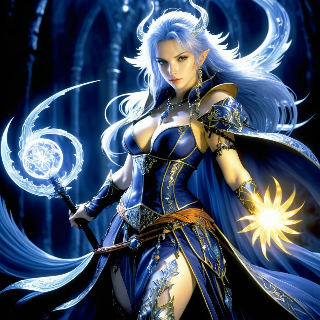 Fantasy character illustration of a sorceress in Final Fantasy by Yoshitaka Amano, Claire Hummel. Styled with cinematic lighting and high detail.