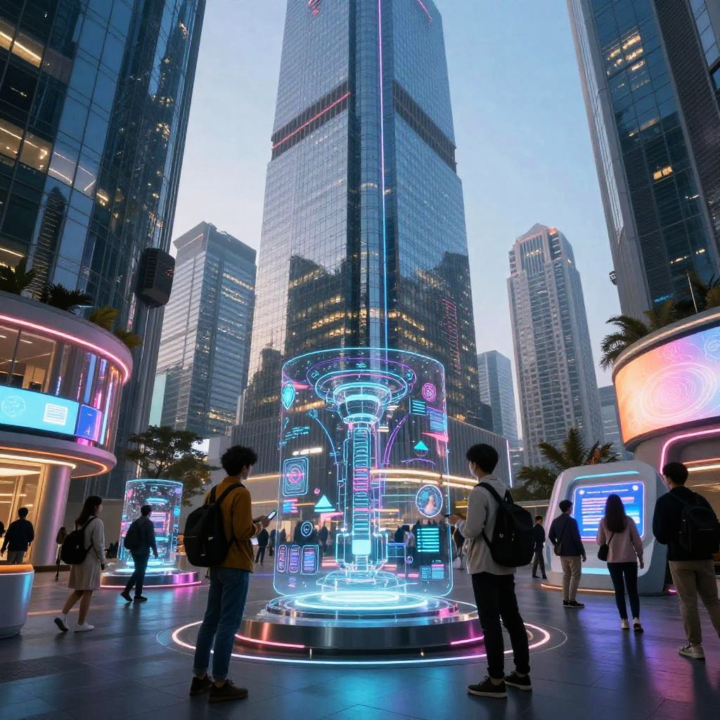 Kmu concept in futuristic cityscape, vibrant neon lights reflecting off glass skyscrapers, diverse group of people collaborating, digital holograms, innovative technology hub atmosphere, cinematic, high detail, ultrawide lens effect