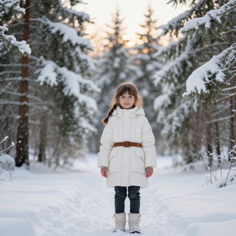 A young girl, around 8 years old, with soft brown hair tied in a braid and warm, curious eyes, is dressed in a white winter coat with a brown belt and white boots. She stands confidently in front of a snowy forest, where towering pine trees are covered in a thick layer of fresh snow, and a faint golden sunrise filters through the trees, casting soft light on the frosty ground. The scene is peaceful and serene, with a gentle breeze causing the snow to drift slowly around her.