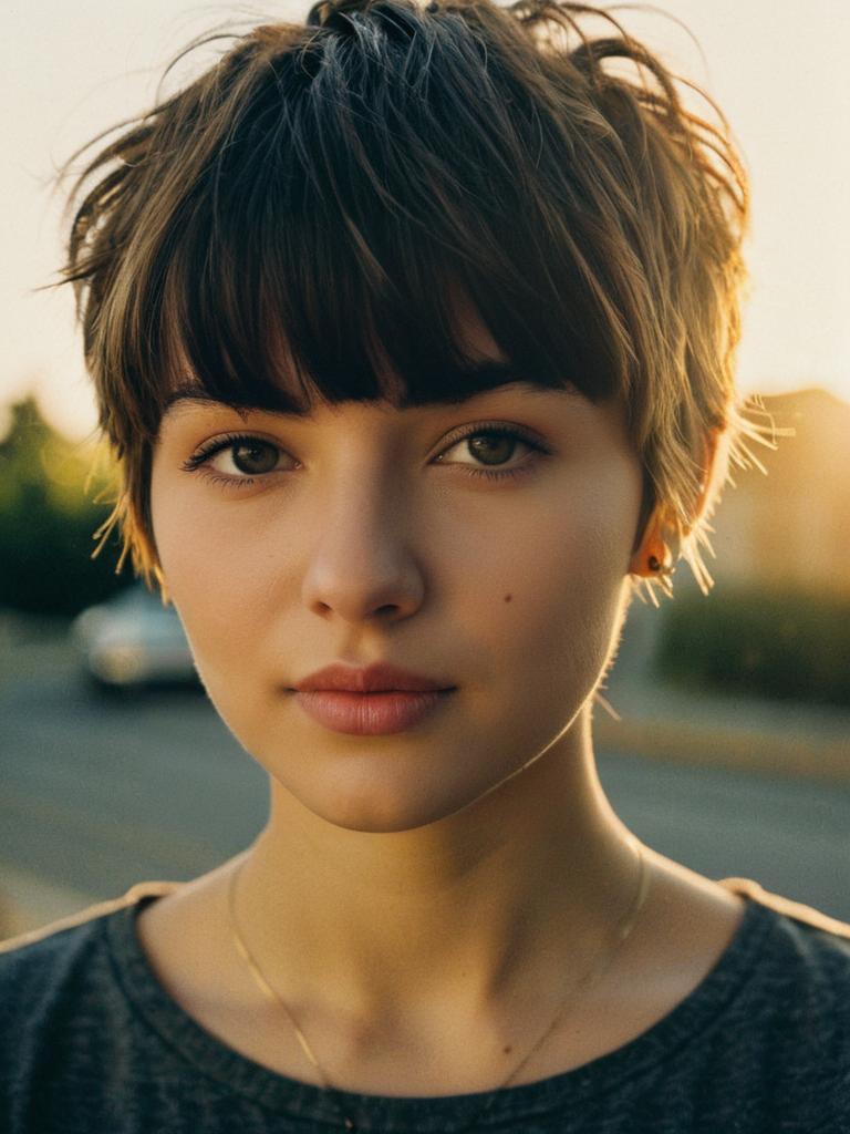 Woman with Messy Pixie Cut and Bangs hairstyle, outdoor candid portrait at golden hour