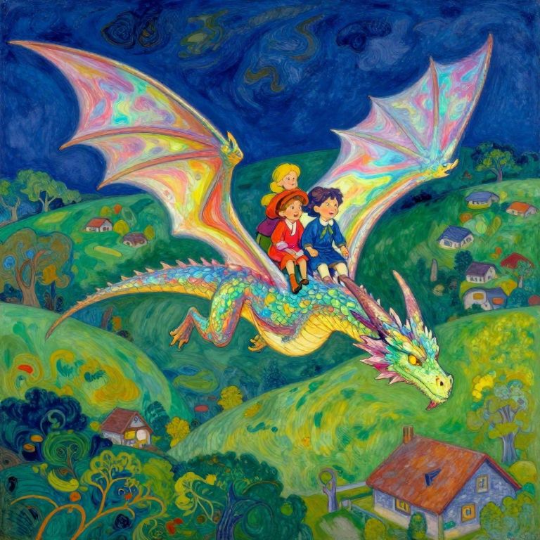 Craft an image in a dreamlike style reminiscent of Marc Chagall's vibrant paintings, portraying a whimsical scene from J.R.R. Tolkien's Middle-earth where a luminous dragon with iridescent wings gracefully glides above the verdant hills of The Shire. From a unique perspective akin to a 'bug's-eye view', observe as this regal creature is accompanied by diminutive hobbits riding on its back, their joyful faces and vibrant attire contrasting against the dragon's shimmering scales. This imaginative tableau evokes both awe and delight, capturing the essence of an extraordinary camaraderie between mythical beings and everyday heroes set in a fantastical landscape filled with rich color palettes and flowing textures.