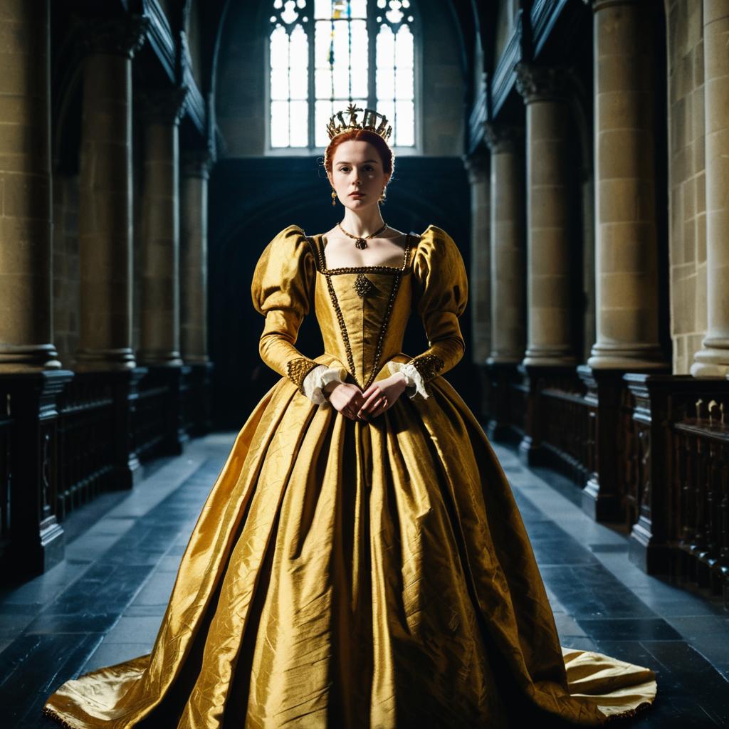 Photograph of a young Caucasian woman standing in a dimly lit, gothic-style cathedral hallway. She wears an elaborate, golden Renaissance-style gown with puffed sleeves and a corseted bodice, adorned with black lace trim. Her hair is styled in an elegant updo, and she wears a small, ornate crown. Her expression is serious, and she holds her hands in front of her. The background features tall, stone columns and a large, arched window with intricate stained glass. The floor is dark stone, and the lighting casts dramatic shadows, highlighting the rich texture of her gown.