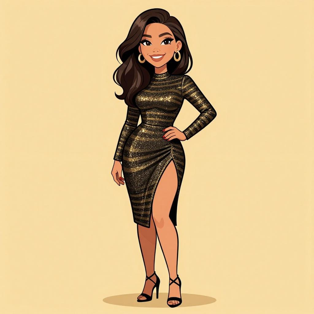 Woman with pretty face and pretty hair. smiling Woman, evening wear, shimmering black and gold striped bodycon dress, high neckline, long sleeves, asymmetric hem with thigh-high slit, black strappy stiletto heels. --sref 1467