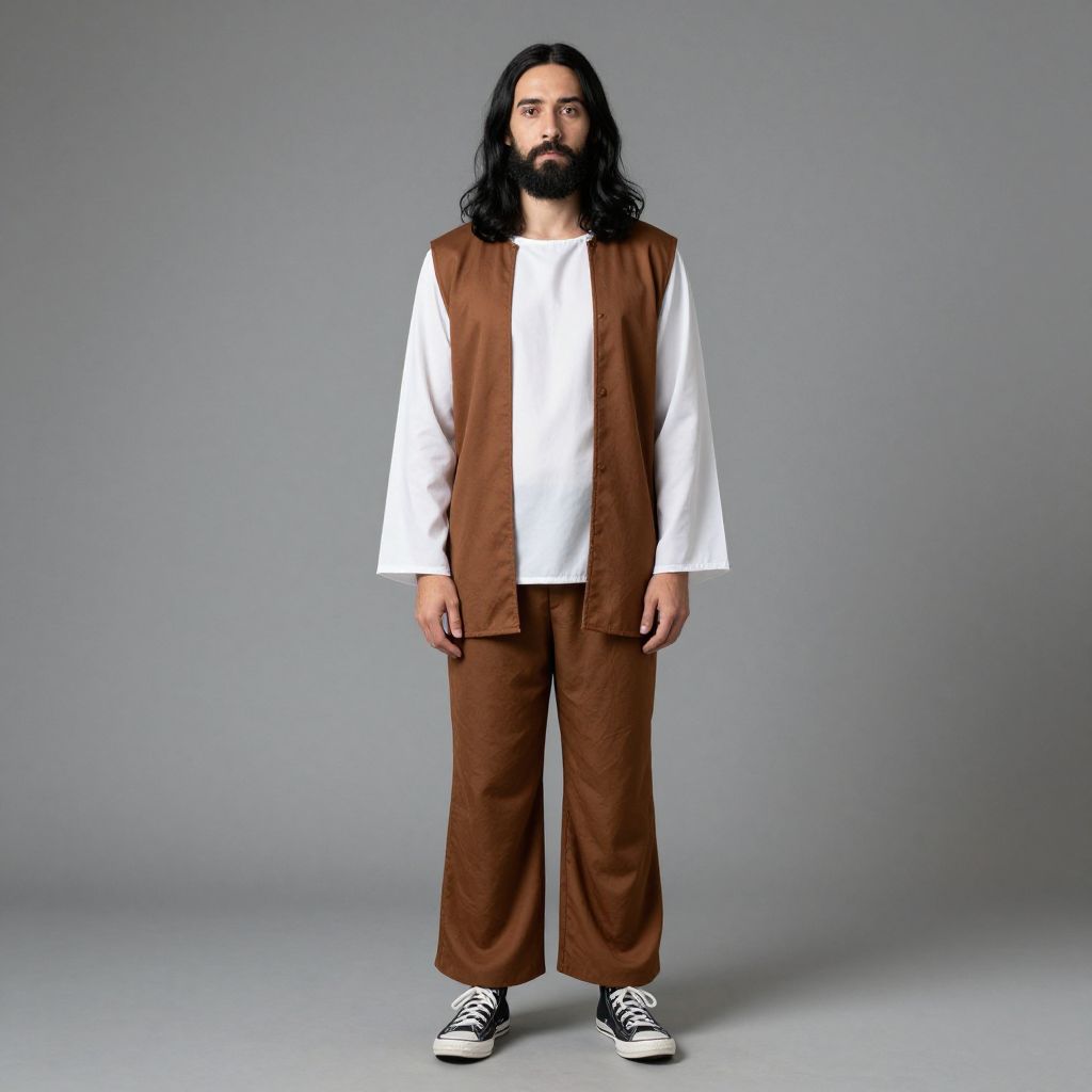 Photograph of a bearded man with long black hair, wearing a white shirt, brown vest, and brown pants, with black Converse shoes,