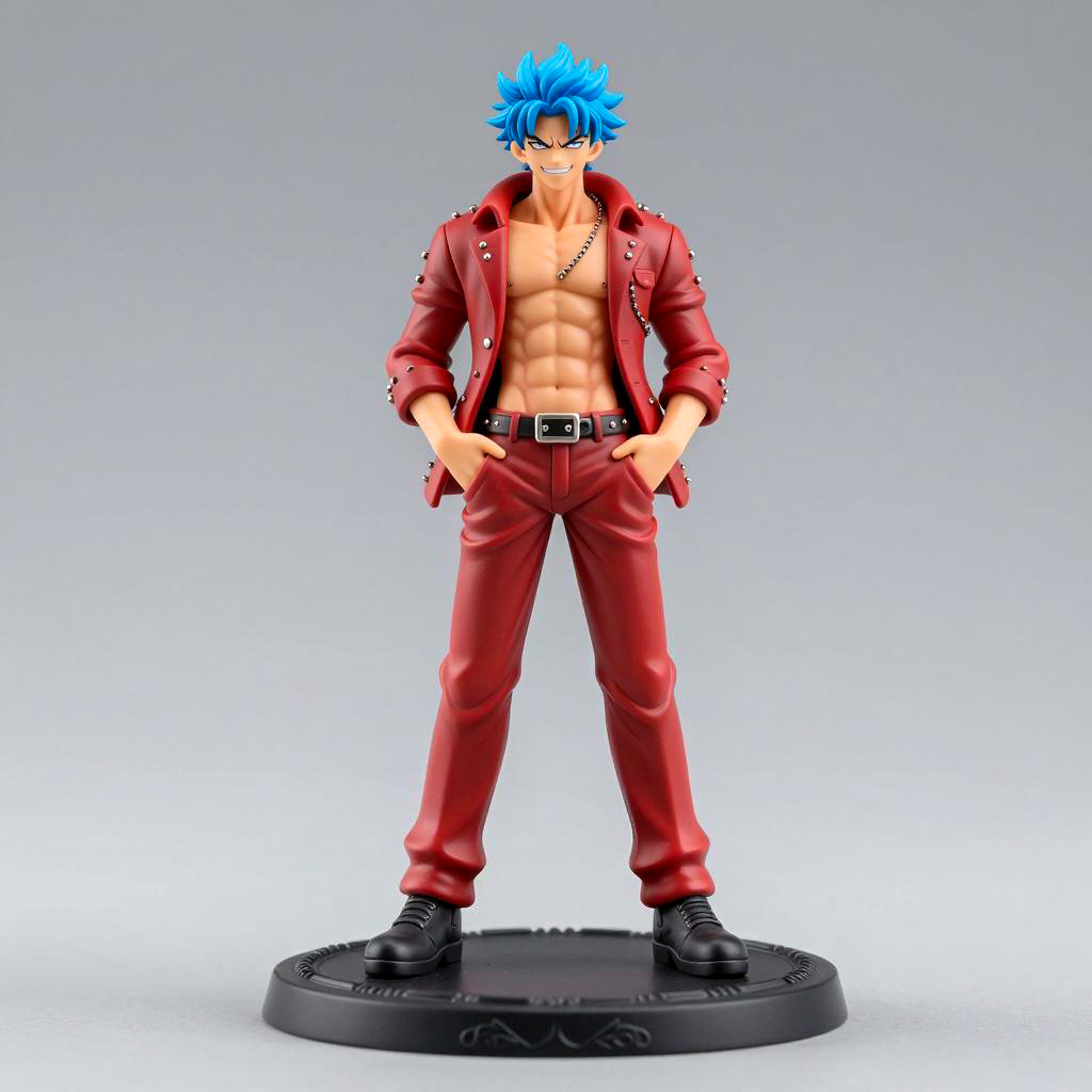 Muscular male figure statue with white hair, red eyepatch, flexing right arm, wearing dark blue sleeveless shirt, gold buttons, white belt, loose pants, pink leg wraps, and sandals. Black background, standing on round wooden base with gold ornament. Left hand on hip. Smiling expression. Realistic, detailed sculpture style.
