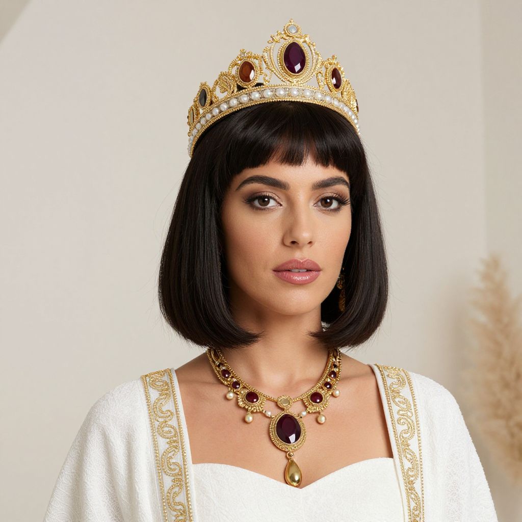 Queen Sheba Costume, a close up of a woman wearing a crown and a white dress