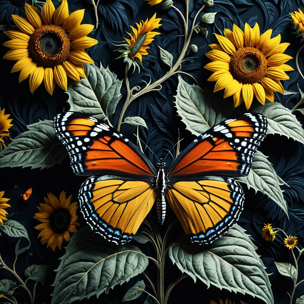 Vibrant Butterfly with Sunflowers and Cyborgs