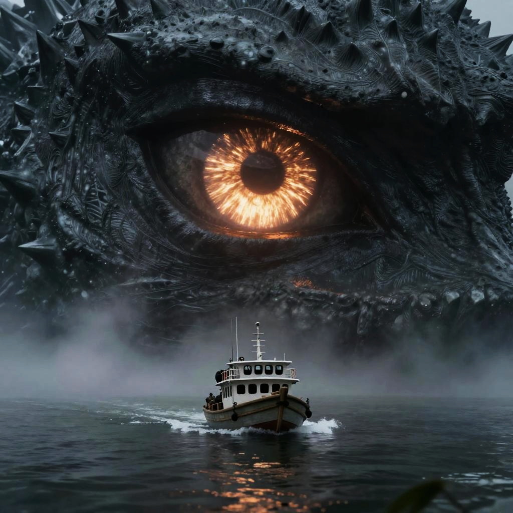 Marco photo, realistic photo of Godzilla's eye is revealed in the darkness and mist, looking at a small boat passing by in the river, best quality, HD, 8K, hyper detailed, film, luminescent on the back