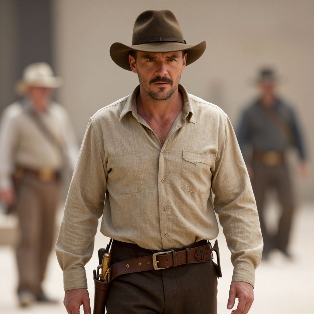 Photograph of a rugged, middle-aged man with a serious expression, wearing a brown cowboy hat, beige checkered shirt with sleeves rolled up, and dark brown pants with a leather belt. He has a slight stubble and a muscular build. In the blurred background, two other men in similar cowboy attire are walking, one in a white shirt and the other in a blue shirt. The setting appears to be an outdoor, sunlit, rural location with neutral-colored walls. The image has a cinematic, dramatic style.