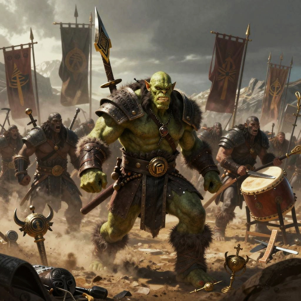 Realistic photo.A fantasy illustration of a fierce orc warlord leading his army, surrounded by battle banners, war drums, and trophies from fallen enemies, in a rugged wasteland, created in gritty comic style, dark and atmospheric realistic photo