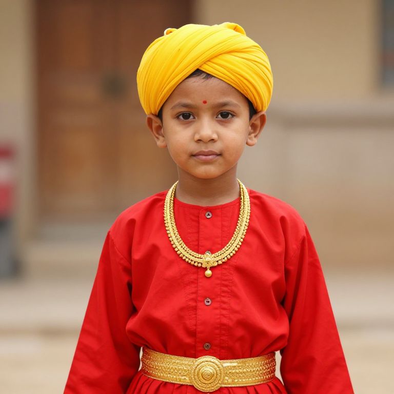 A young boy is wearing a traditional red outfit with a yellow turban on his head. He is also wearing a gold necklace and a gold belt.