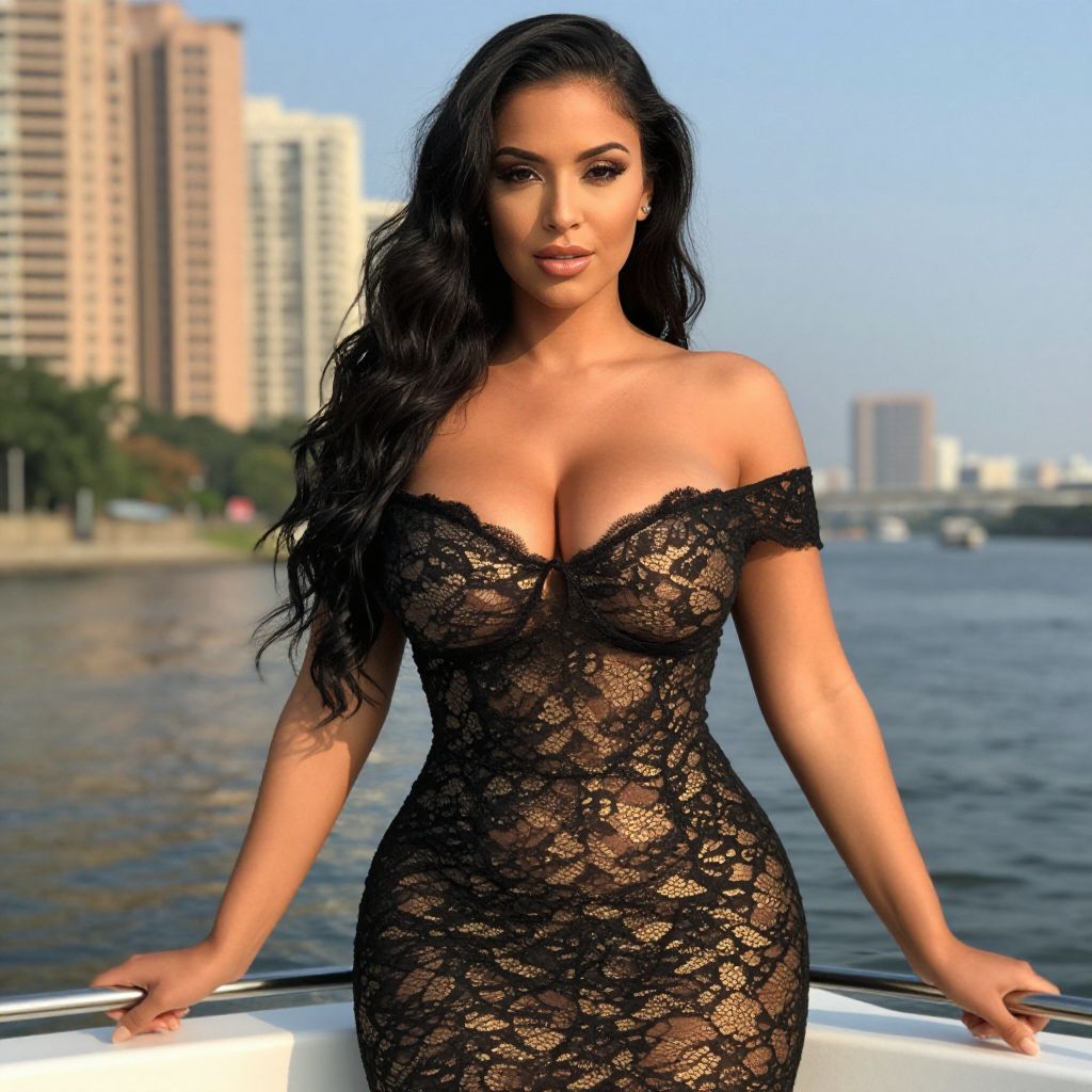 Photograph of a woman standing on a rocky hilltop with a scenic valley and forested hills in the background. She has long, wavy black hair and is wearing a form-fitting, sleeveless, cream-colored dress with a deep V-neck. Her skin is light, and she has a confident, poised expression. The sky is clear with a hint of blue.