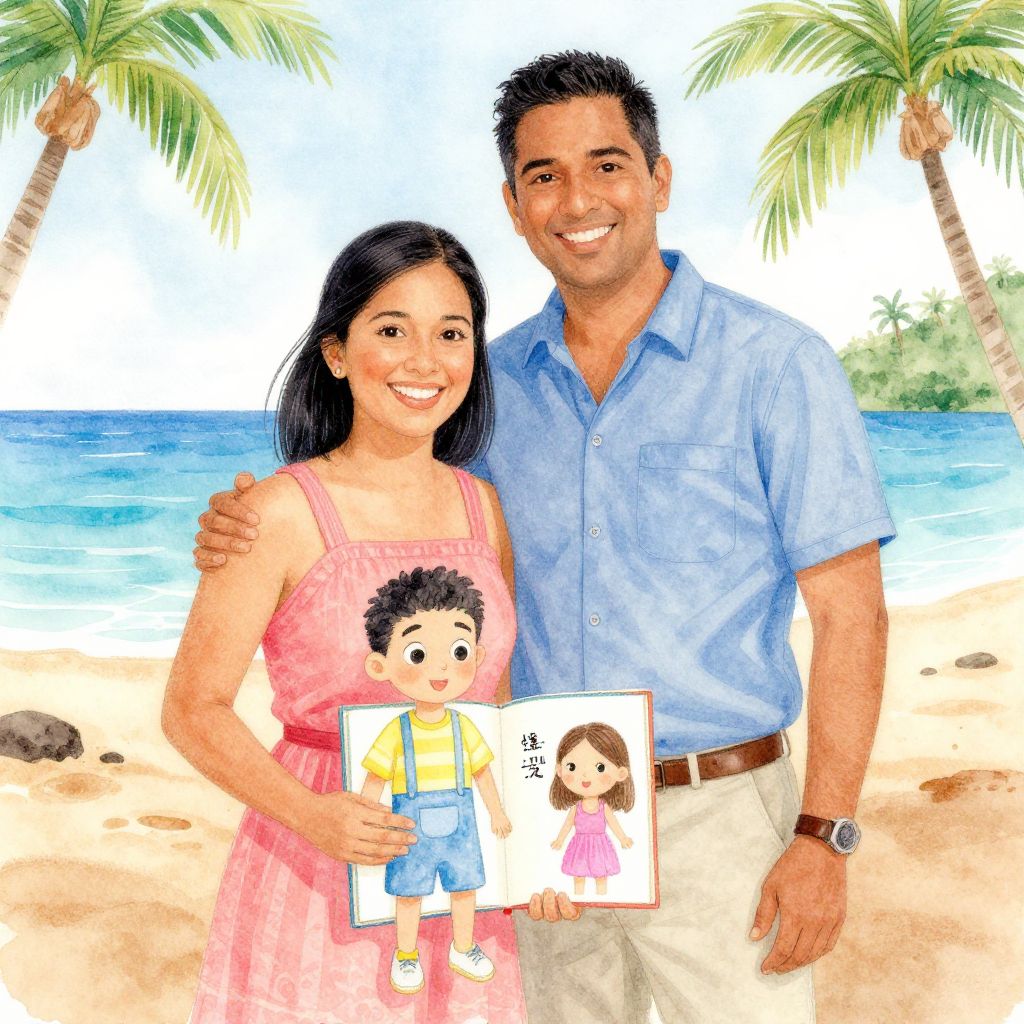 Laser happy half-american half-indian couple in hawaii, watercolour style, child book drawings, playful design,