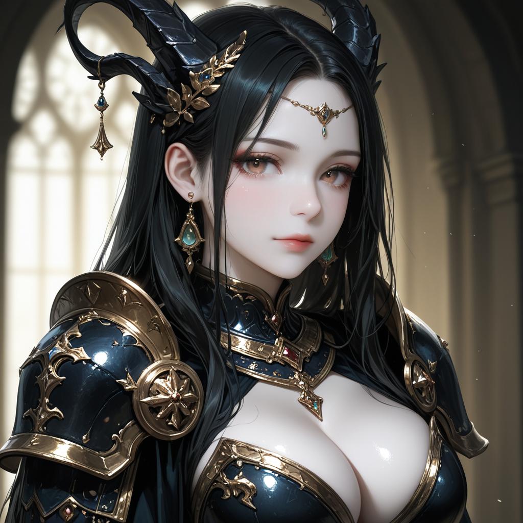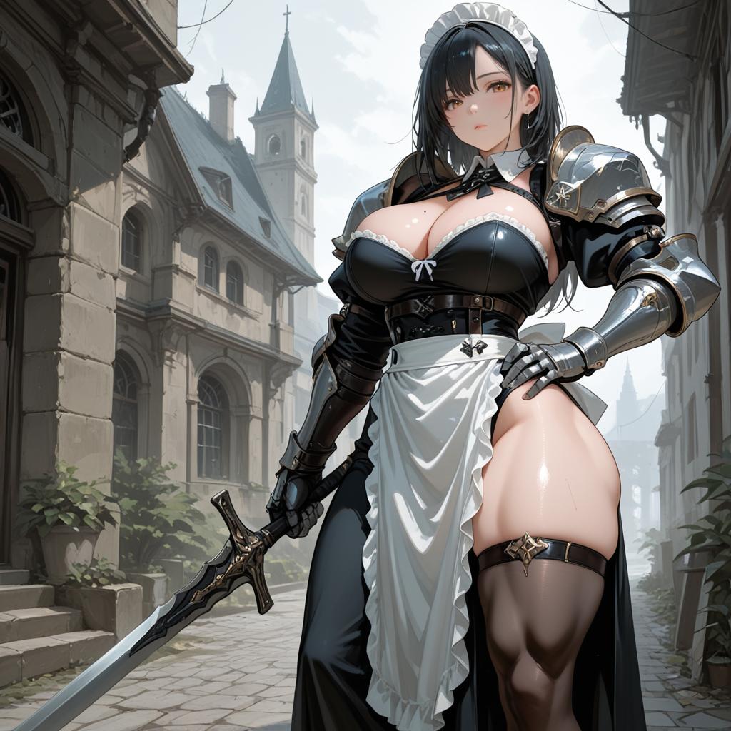 1girl, breasts, armor, weapon, blonde hair, blue eyes, navel, bikini armor, shoulder armor, long hair, large breasts, solo, pauldrons, cleavage, looking at viewer, earrings, collar, holding, bikini, jewelry, holding weapon, toned, thighhighs, polearm, swimsuit
