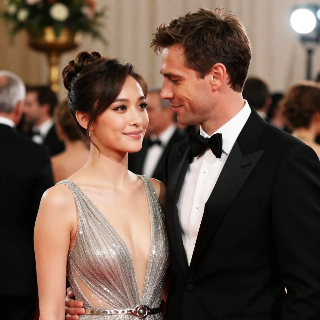 Photograph of a man and woman in an elevator. Man in dark suit, white shirt, striped tie, light brown hair, smiling. Woman with shoulder-length brown hair, white strapless dress, smiling. Elevator wall and control panel on left. Man stands slightly behind woman, both facing camera.