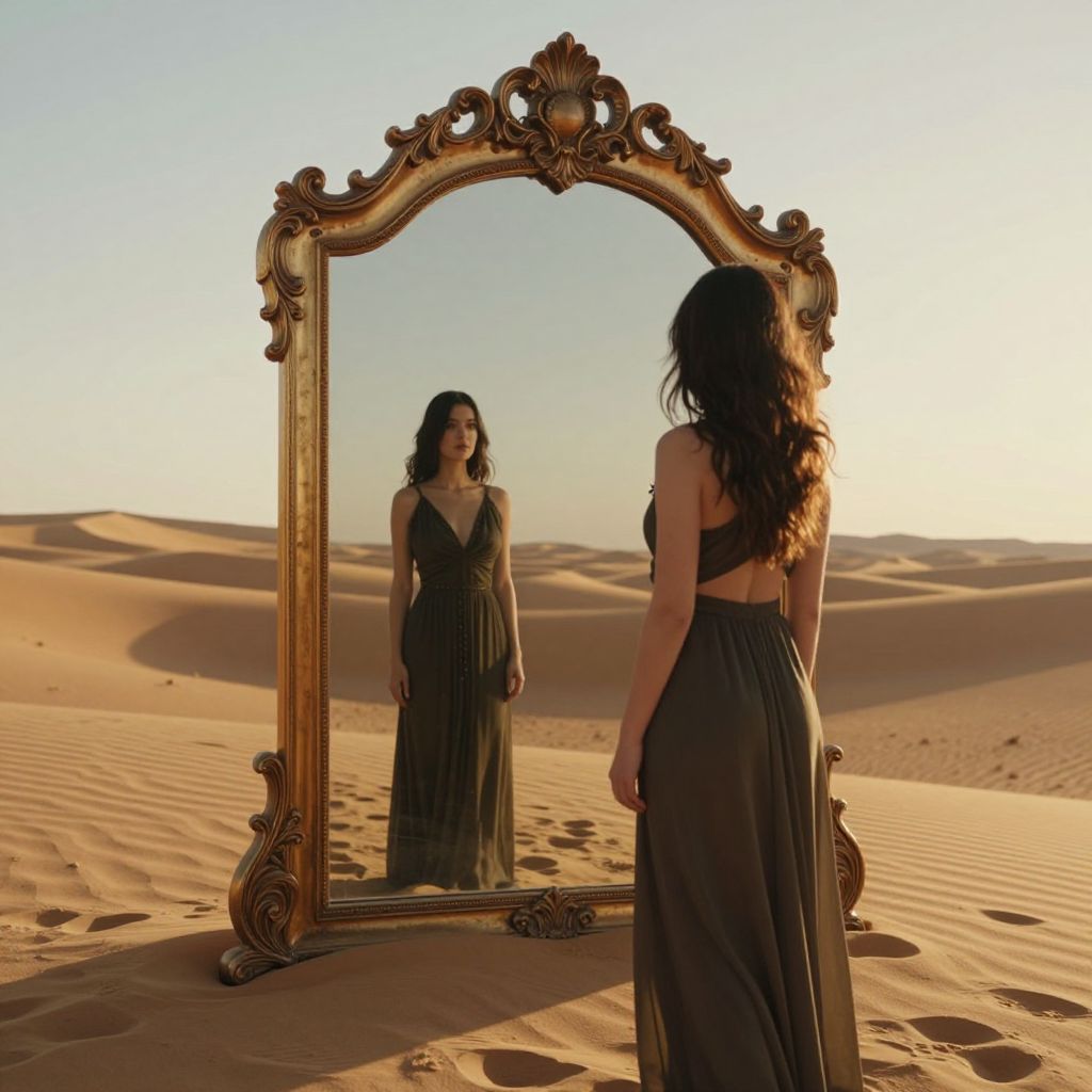Photograph of a woman with long dark hair in a flowing black dress, standing in a desert, facing an ornate gold mirror reflecting her image,