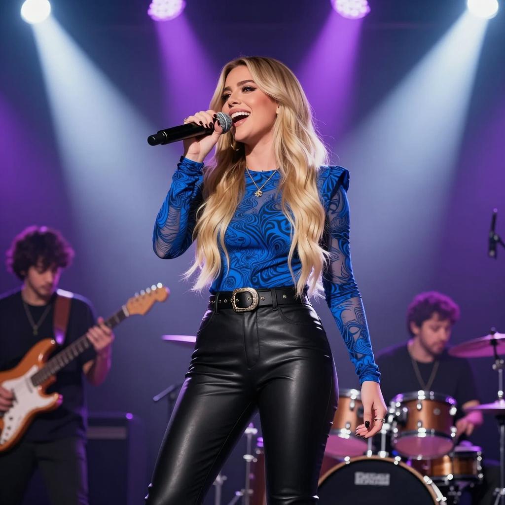 Female singer with long blonde hair, wearing a blue patterned top and black leather pants, holding a microphone, singing passionately. Bright stage lights with white and purple beams illuminate her. Two musicians in the background on stage, one playing guitar, one drumming. She has a belt with a large buckle.