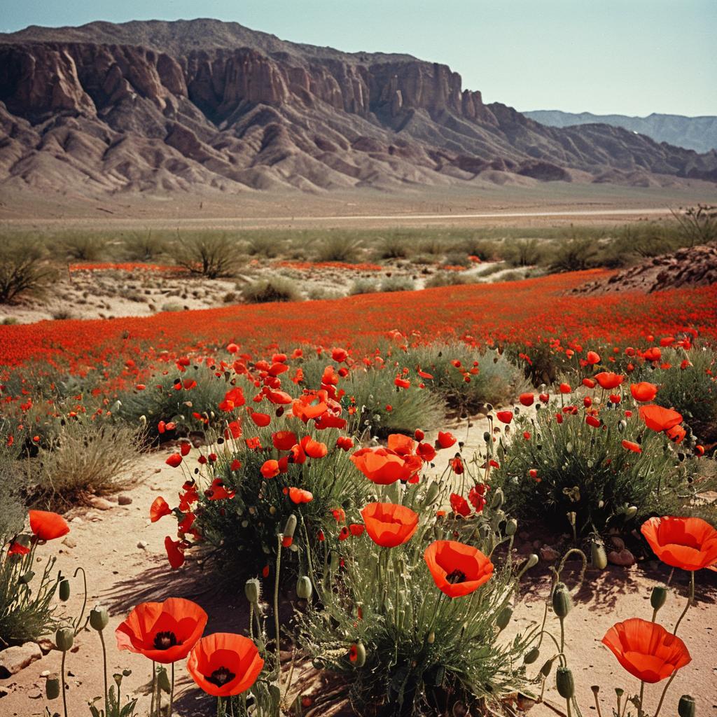 Red poppies in bloom on a desert valley, in the style of photorealistic painting, warm red and pale orange, blending Sonoran and Saharan deserts.