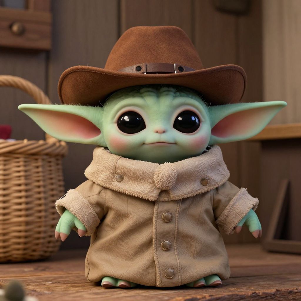 The image features a charming, chibi-style depiction of Baby Yoda, also known as Grogu, from the Star Wars universe. This adorable character has large, expressive eyes and a soft, rounded face, with green skin and large, pointed ears. Grogu is dressed in a cowboy outfit, complete with a brown hat, scarf, and jacket, giving him a rugged, adventurous look. The background is a rustic, wooden setting, with a woven basket and a wooden bench, adding to the cozy, homely atmosphere. The overall composition is well-balanced, with Grogu as the central figure, surrounded by the warm, earthy tones of the wooden elements. The image is a high-resolution 8k portrait, capturing the intricate details of Grogu's costume and the textures of the surrounding environment.