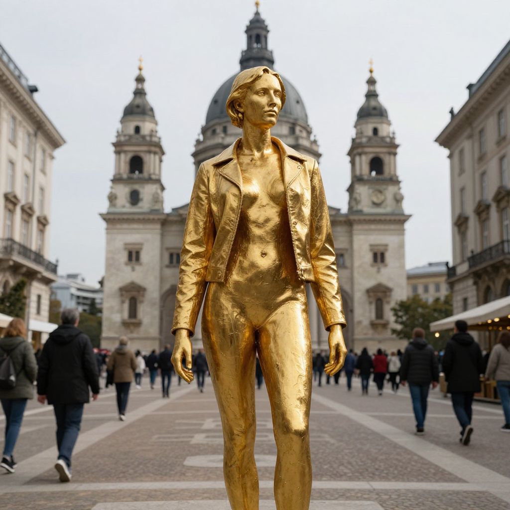 Golden statue of a woman in a sleek leather jacket stands prominently in a bustling city square, her poised silhouette framed by the grandeur of a domed cathedral and flanked by historic buildings as crowds weave through the background.