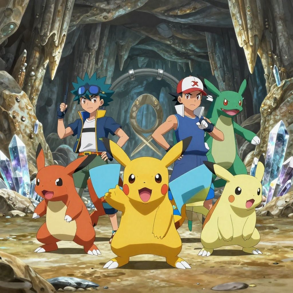 Ground type gym leaders in a cavernous underground gym, surrounded by stalactites and crystals, commanding earth and rock Pokémon, intense focused expressions, cinematic lighting.