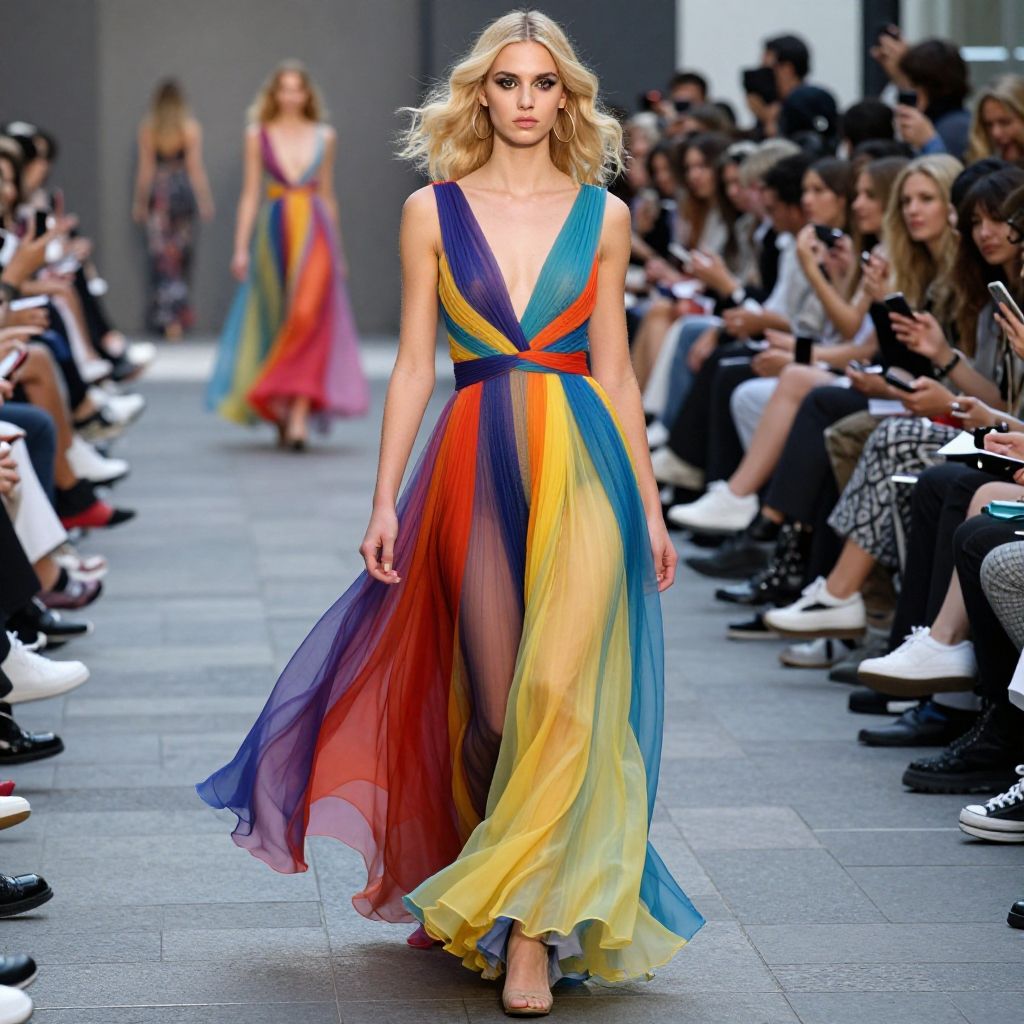 Blonde runway model striding down a vibrant runway, flowing designer gown, bold makeup, energetic crowd in background, modern urban setting, glossy magazine cover style
