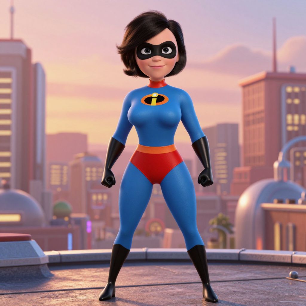 A cinematic, realistic shot of a woman in a full Pixar-style costume from 'The Incredibles'—a dynamic blue, red, and white suit with a mask and flying boots—standing on a rooftop at sunset in a retro-futuristic city, with her face lit by soft city lights, showing confidence and determination, detailed fabric and realistic facial features.. The woman has big tits and cute face