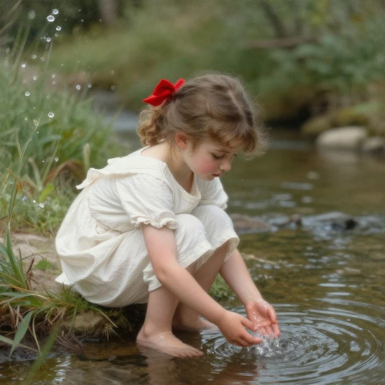 A lonely beautiful little girl, wearing white cloths, and a red bow in her hair, playing with the water, sitting by the side of a creek, in the painting style of renoir, 8 k, detailed, rule of thirds