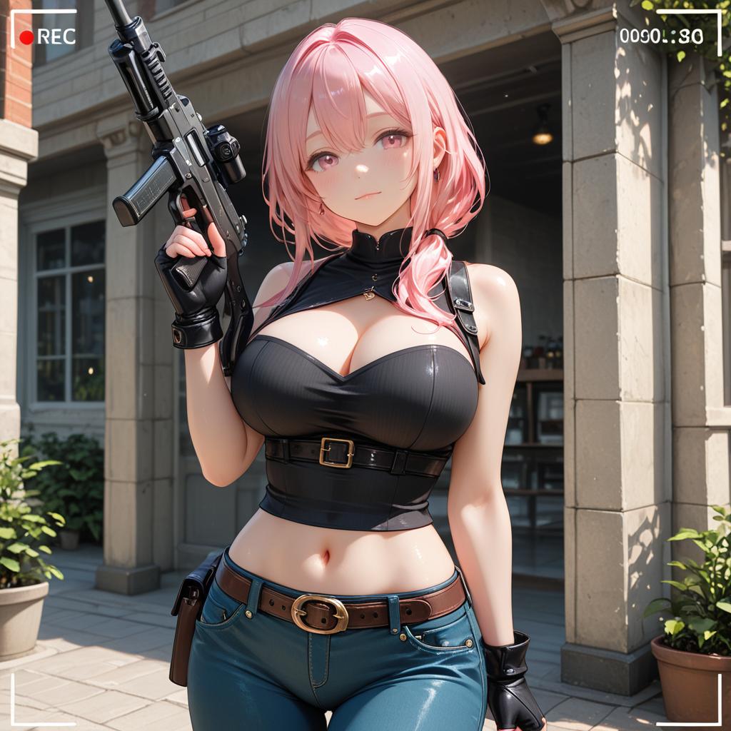 3dmm, 3d, Game, icon, playmarket, JinxLol, mature female, 1girl, (pink eyes), solo, looking at viewer, navel, gloves, fingerless gloves, character name, midriff, bare shoulders, gun, crop top, belt, outdoors, casual, smile, look at viewer, camera focus on face, halfbody