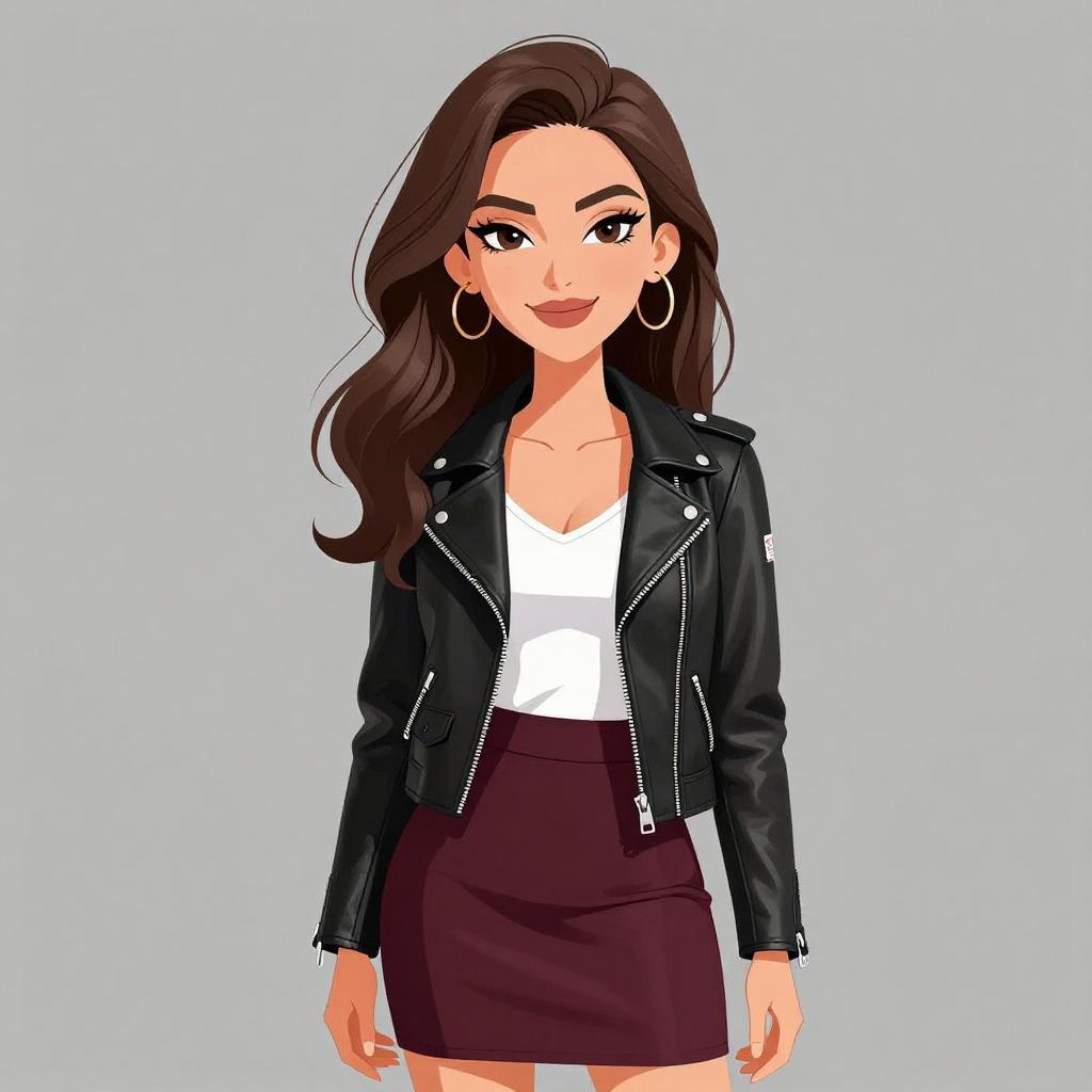 Digital illustration of a confident young woman with long brown hair, wearing a black leather biker jacket with asymmetrical zipper and lapel collar. She has on a white V-neck t-shirt tucked into a form-fitting, high-waisted burgundy mini skirt. The woman is smiling and accessorized with gold hoop earrings, standing against a neutral gray background.