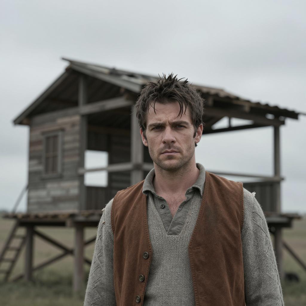 A rugged, medium-build man with dark, slightly messy hair and a serious expression. He wears a ured brown vest over a grey, knitted shirt. In the background, a dilapidated, wooden structure with a raised platform stands against a cloudy sky. The structure has broken, uneven beams and a small, sheltered area. The man is centered in the foreground, with the structure slightly blurred in the background.