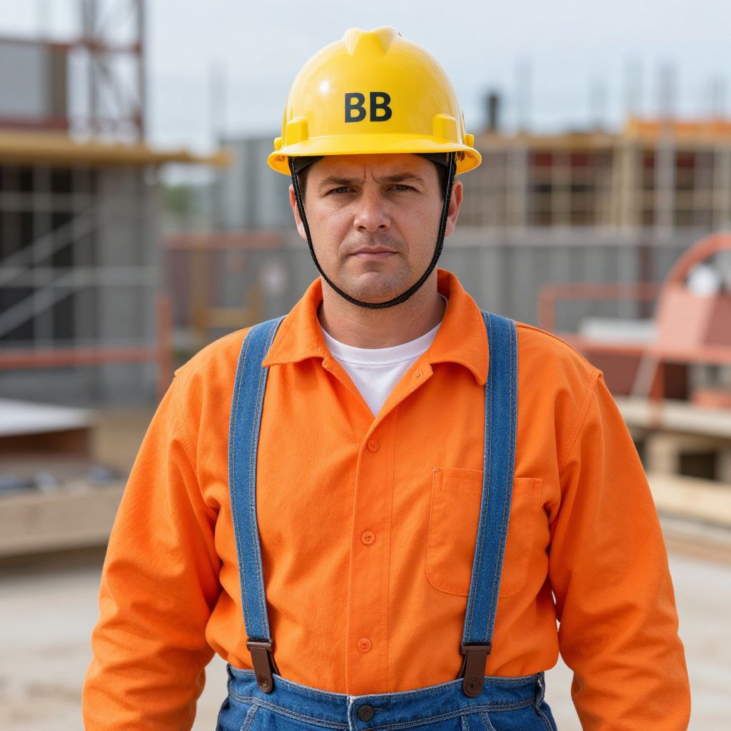 Photograph of a white male construction worker in a bright orange shirt, blue overalls, yellow hard hat labeled "BB," standing on a construction site