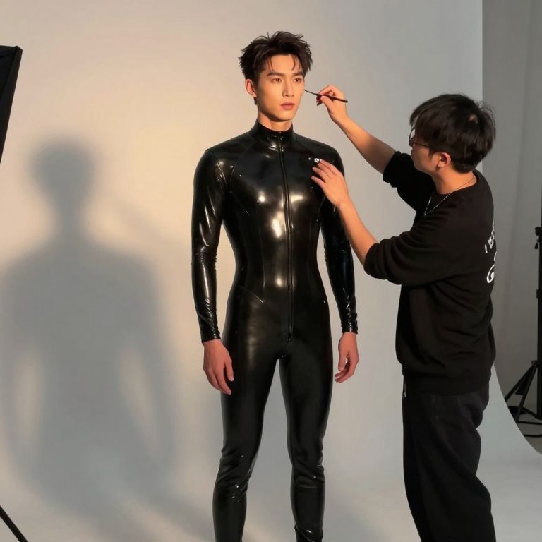 Photograph of an Asian man with short, dark hair, standing in front of a white backdrop. He is wearing a tight, shiny black latex bodysuit with a zipper down the front. To his right, another Asian man with short black hair, dressed in a black long-sleeve shirt and black pants, is adjusting the man's hair with his right hand. The lighting is soft, creating subtle shadows. The background is plain and uncluttered, focusing on the subjects. The man in the latex suit has a neutral expression, while the assistant's face is partially obscured. The overall scene has a fashion photography studio vibe.