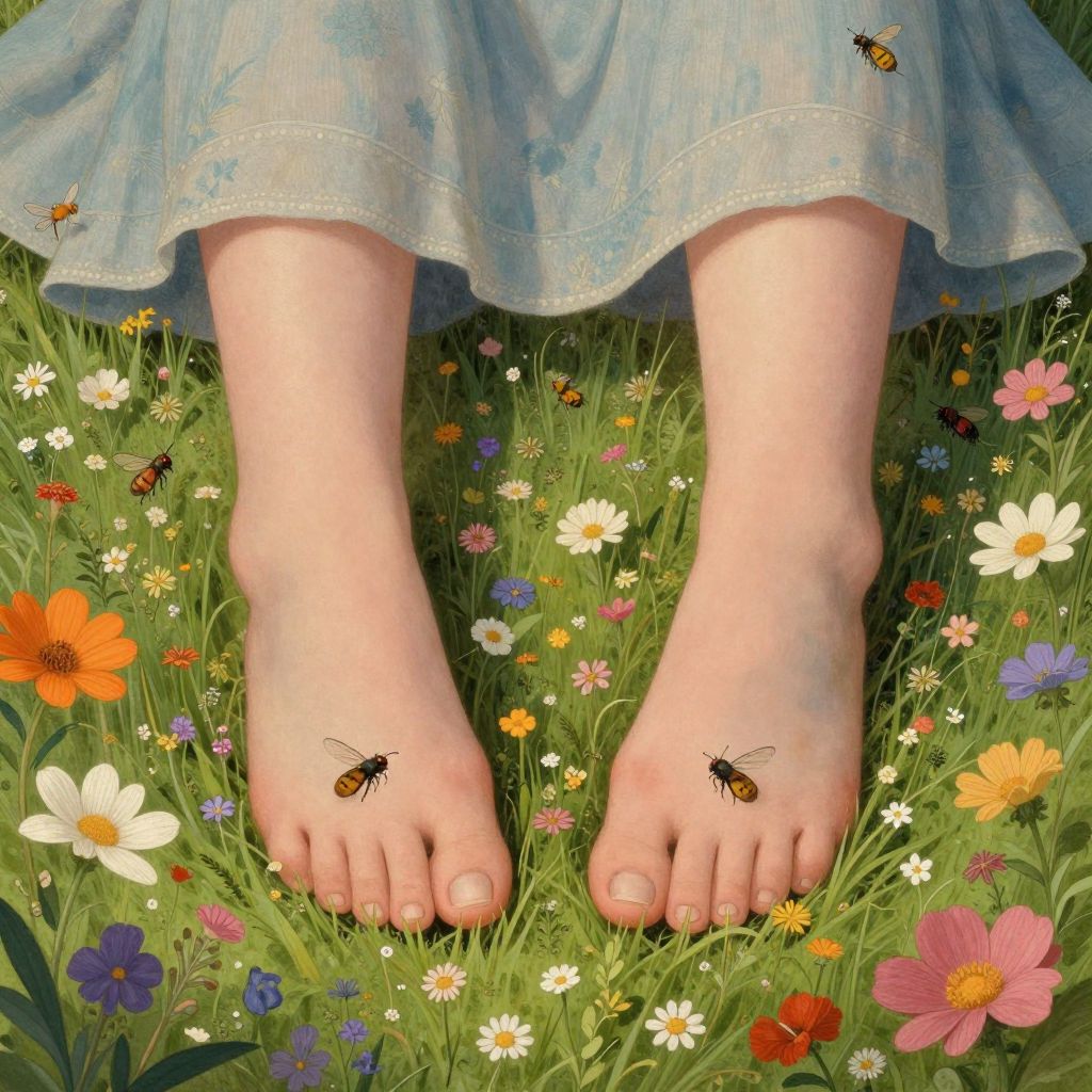 Digital illustration of pale, bare feet standing in a lush, colorful meadow filled with various blooming flowers, including orange, white, yellow, purple, and pink daisies. Two butterflies, one orange and one yellow, rest on the toes of the right foot. The person is wearing a light blue, flowy, floral-patterned skirt that slightly covers the feet. The background is vibrant and detailed, with green grass and an array of small flowers, creating a whimsical, serene garden scene. The image has a realistic yet slightly fantastical style.