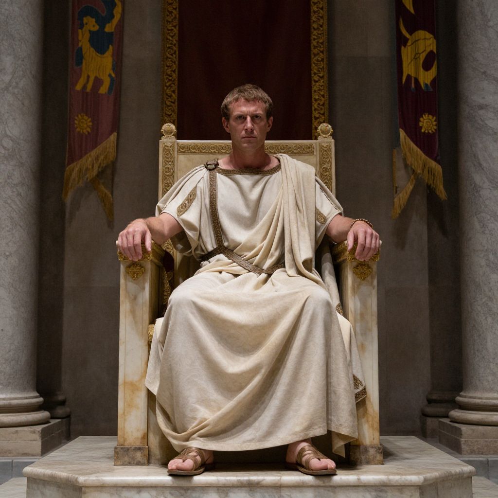 Photograph of a muscular man with short brown hair, wearing a white toga and sandals, seated on an ornate throne, flanked by columns