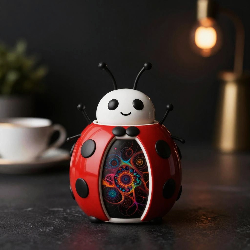 Ladybug-Shaped Coffee Cup with Abstract Fractal Design