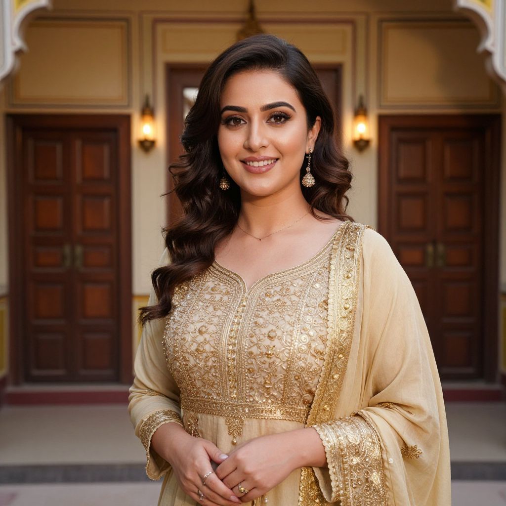 Photograph of a smiling Indian woman with long, wavy dark brown hair, wearing a golden, ornately embroidered traditional saree with a low neckline and long sleeves. She has brown eyes, dark eyebrows, and is adorned with gold earrings and a simple necklace. The background features a beige building with dark wooden double doors and two warm yellow wall sconces. The setting suggests an elegant, traditional environment. The woman stands centered in the foreground, hands gently clasped in front of her. The lighting is soft, highlighting her serene expression and the intricate details of her attire.