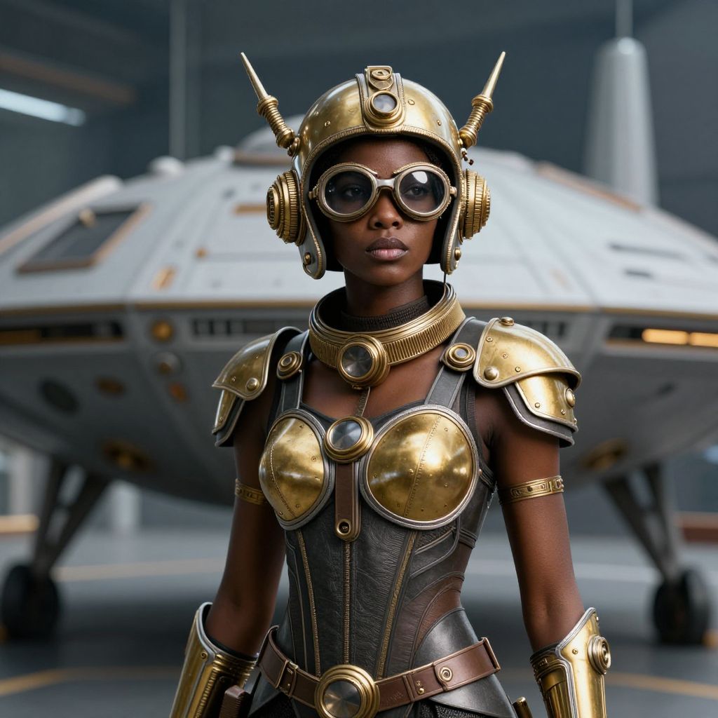 A futuristic African woman in a gold and silver steam punk helmet and goggles stands in front of a spaceship, embodying a marvel super hero.