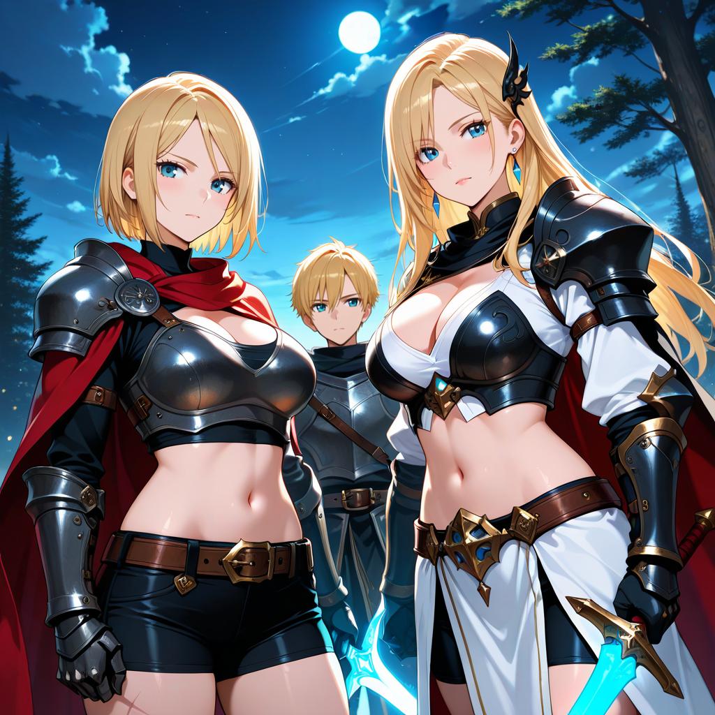 Multiple girls, weapon, blue eyes, sword, navel, blonde hair, breasts, holding, long hair, looking at viewer, holding weapon, holding sword, short hair, armor, earrings, jewelry, midriff, outdoors, shoulder armor, cape, sky, skirt, white skirt, shirt, black cape, cleavage, large breasts, cowboy shot, pauldrons, medium breasts, 2girls, hair ornament, closed mouth, shorts, cloud, 3girls, standing, vambraces, glint, belt, long sleeves, black shorts, siblings, bangs, crop top, stomach, red cape, mole under eye, night, parted bangs, lips, bracer, v-shaped eyebrows, serious, bike shorts, gauntlets, breastplate, pelvic curtain, glowing, miniskirt, short shorts, parted lips, mole, black shirt, 1boy, frown, single pauldron, sisters, glowing weapon, cover image, tree, scar, white shirt, hand on another's shoulder, thighhighs, pointy ears, black skirt, day, nature