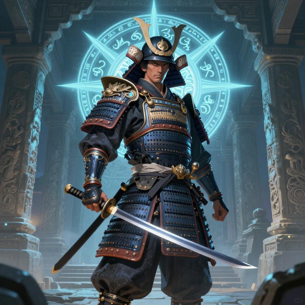 Digital illustration of a fierce samurai warrior wearing detailed, ornate armor with intricate designs. The warrior stands in a stone temple illuminated by glowing blue light and ancient carvings, holding a katana sword. The background features mystical symbols and a radiant circular emblem, enhancing the epic atmosphere.