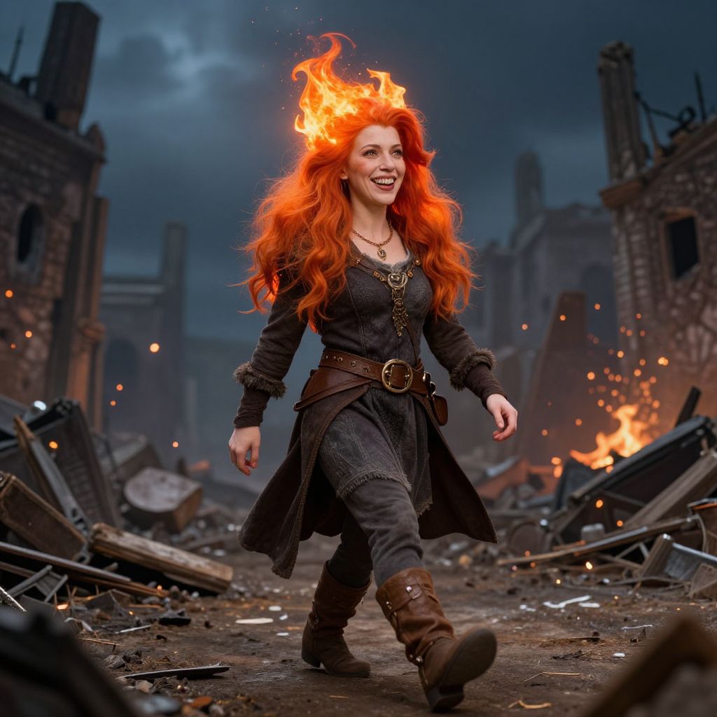 Photograph-like CGI of a red-haired woman with fiery hair, wearing a black, long-sleeve, medieval-style dress with a brown belt and boots, walking through a dark, ruined cityscape. Her hair is ablaze with vibrant orange flames. The background features crumbling brick buildings and scattered debris, with small fires and glowing embers adding a sense of chaos. She smiles confidently, with a necklace around her neck. The sky is overcast, adding a gloomy contrast to the fiery elements. The image combines fantasy and post-apocalyptic themes, with a dramatic, dynamic composition.