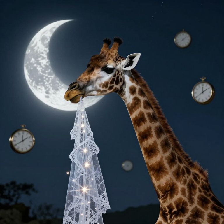 A melancholic giraffe weaves starlight into lace patterns with its tongue, adorning the moon in ethereal garments beneath an audience of floating clocks.