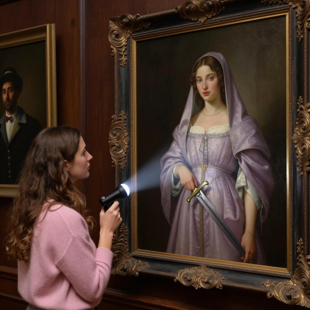Photograph of a woman with short blonde hair, glasses, and a red cardigan, seated on a chair in a library. Beside her, a painted portrait of the same woman in a blue dress with gold trim, holding a bouquet, against a dark, cloudy background. Bookshelves and a wooden stool in the background. She has a neutral expression. The painted portrait is realistic and detailed. The woman in the photograph and painting have similar hairstyles and facial features.
